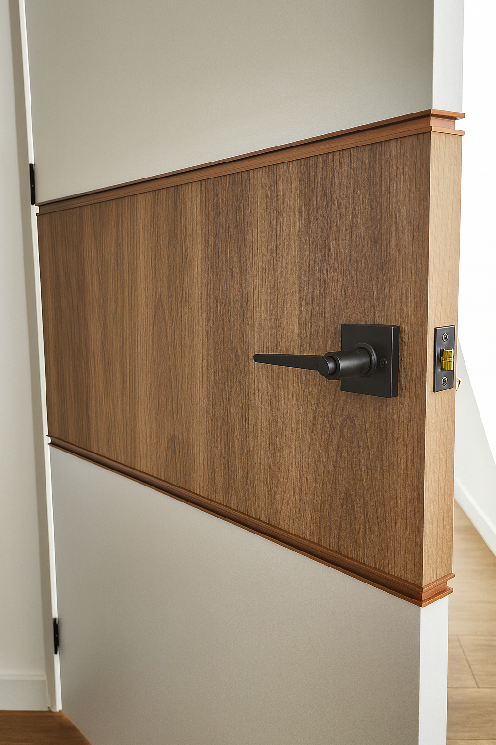 La franja central de esta puerta resalta la veta y textura del material, creando un punto focal elegante y moderno. La chapa en color negro mate aporta contraste y carácter, logrando una pieza que muestra sofisticación y funcionabilidad en un mismo elemento.