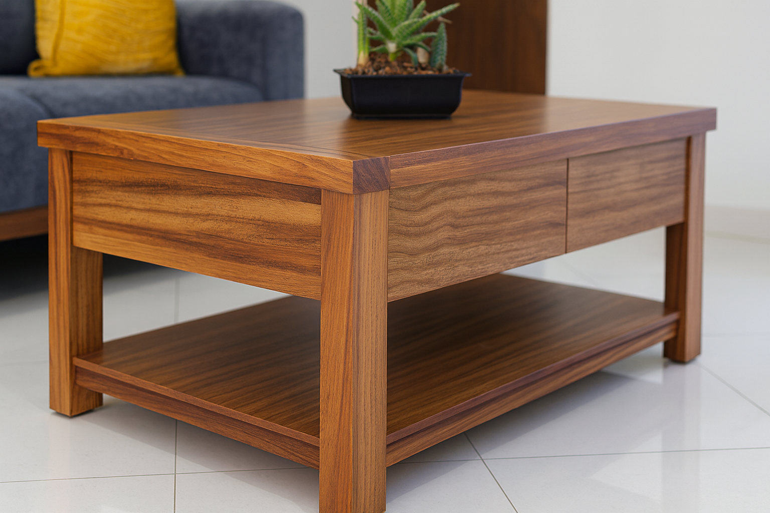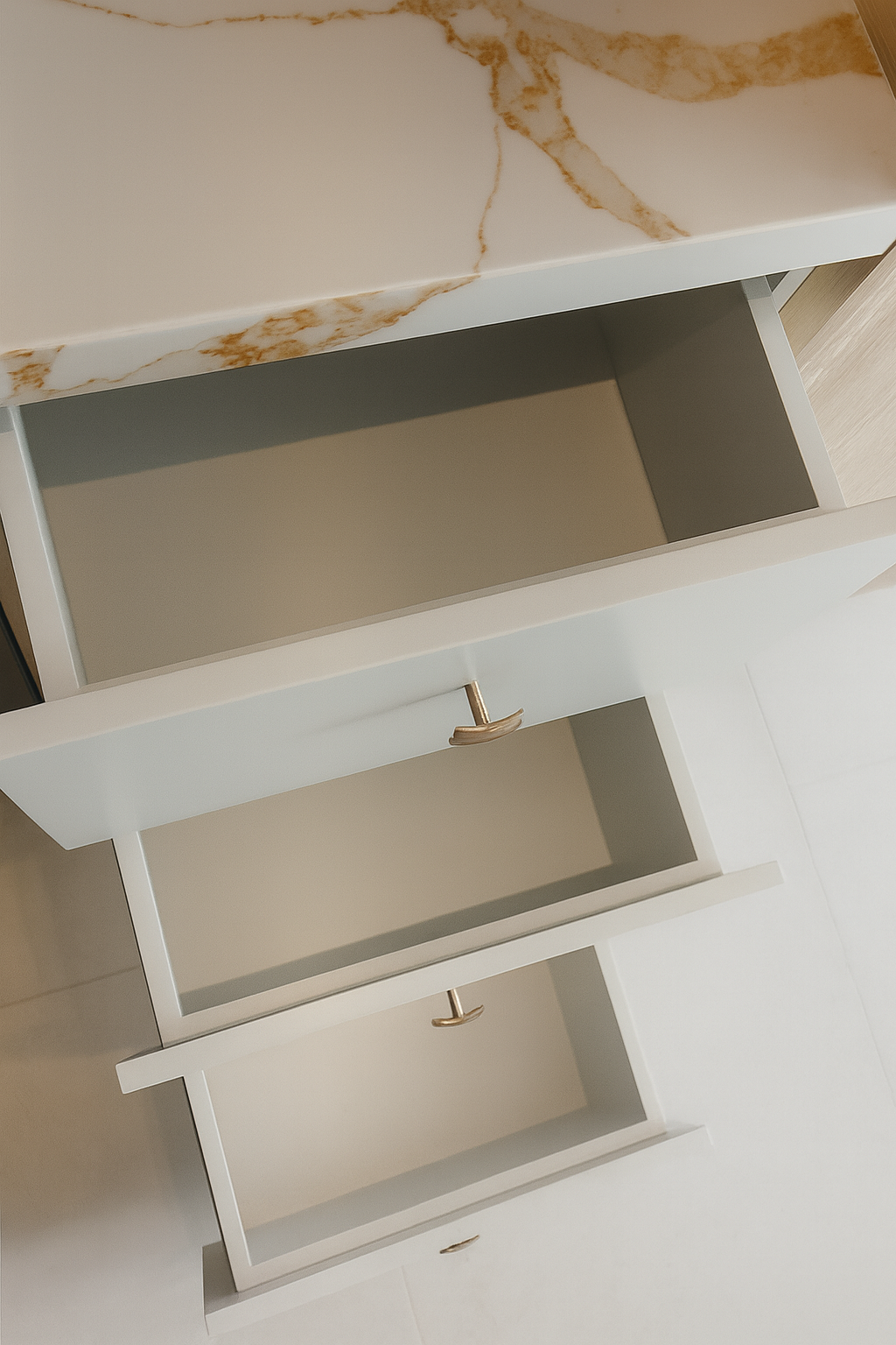 Los cajones amplios, acompañados de herrajes en tono dorado, ofrecen un toque de sofisticación, mientras que la cubierta tipo mármol añade un aire premium y atemporal.