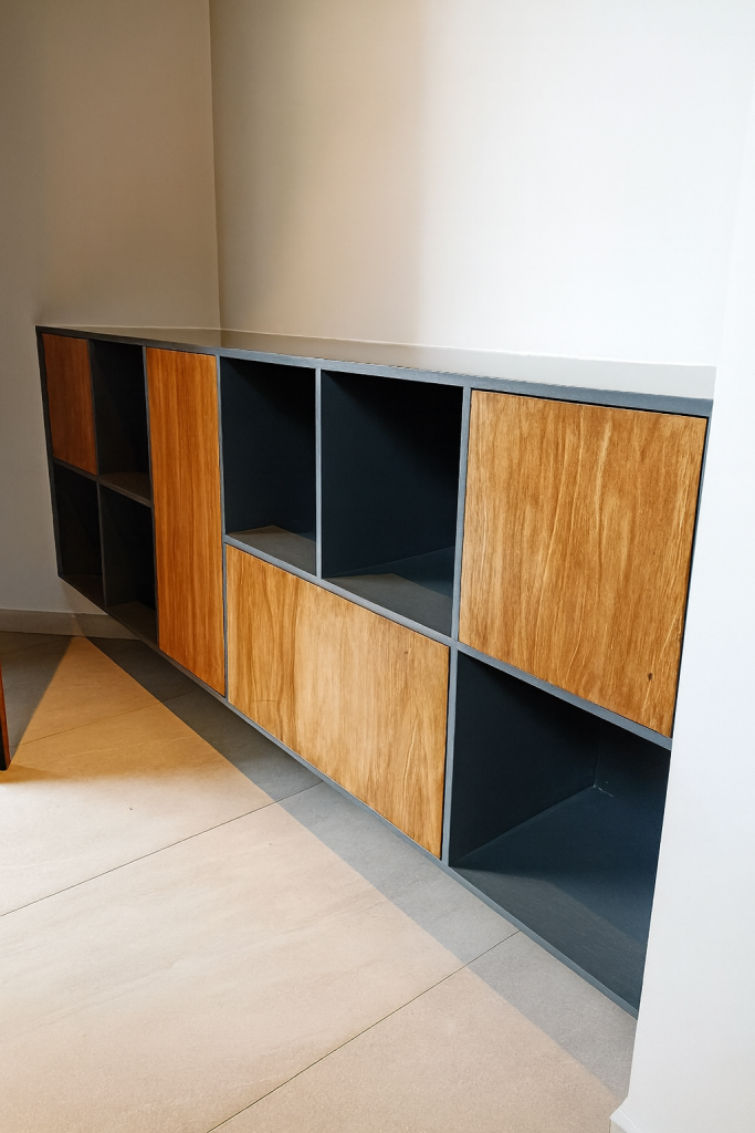 La dueña de este tocador buscaba un mueble sobrio, elegante y en armonía con el estilo de su casa. No quería una pieza genérica de tienda, sino algo con identidad propia. Para aprovechar al máximo la esquina, diseñamos un mueble en forma de “L” y añadimos dos espejos, creando una sensación envolvente que recuerda a un pequeño salón de belleza.